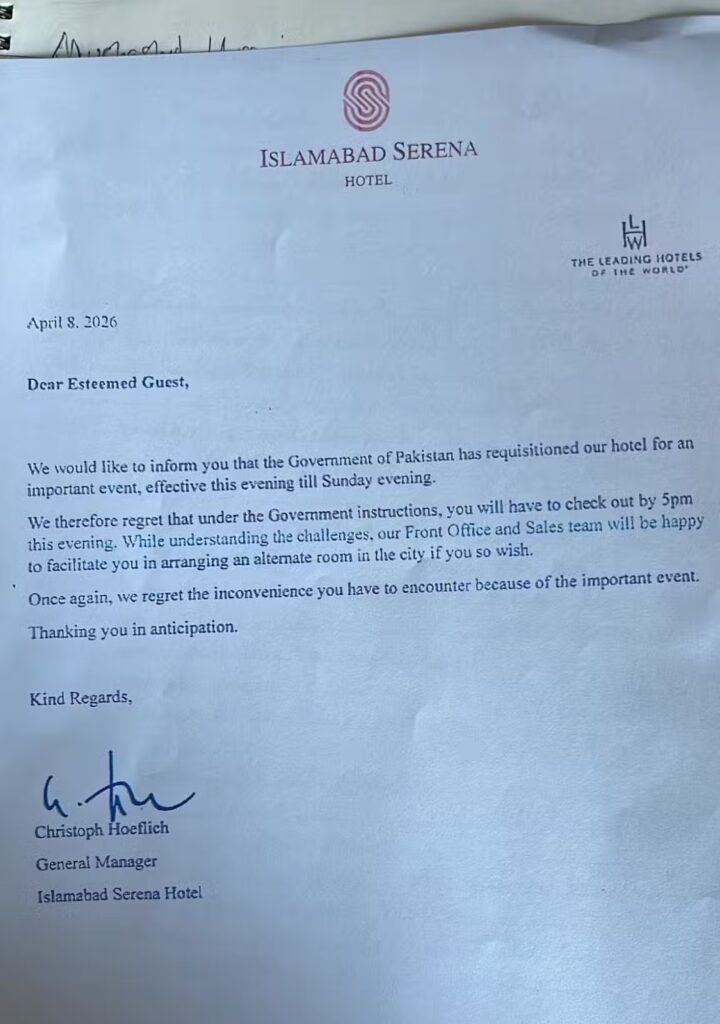 Islamabad, April 9, 2026 — The Government of Pakistan has temporarily requisitioned the prestigious Serena Hotel in Islamabad ahead of high‑level peace talks between the United States and Iran, prompting the hotel to ask all guests to check out by late afternoon today.
