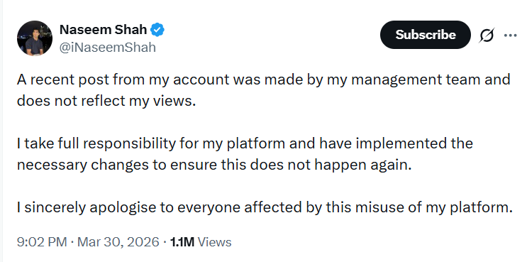 The post asked why Maryam Nawaz received Queen-like treatment at Lord’s. Naseem Shah deleted the tweet minutes later. He claimed his account was hacked. The PCB rejects the explanation and issues a show-cause notice on March 27, 2026.