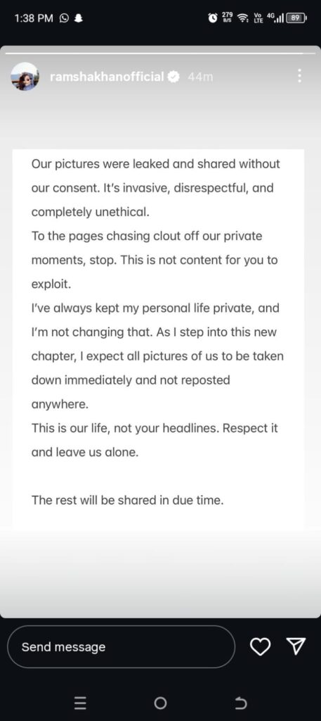 Ramsha Khan broke her silence on Instagram just an hour ago. She called the leak “invasive” and “unethical.” She feels deeply disrespected. Her message to clout-chasing pages was clear: “Stop.” She confirmed a “new chapter” has begun. However, she expects privacy. She wants all leaked photos removed immediately.